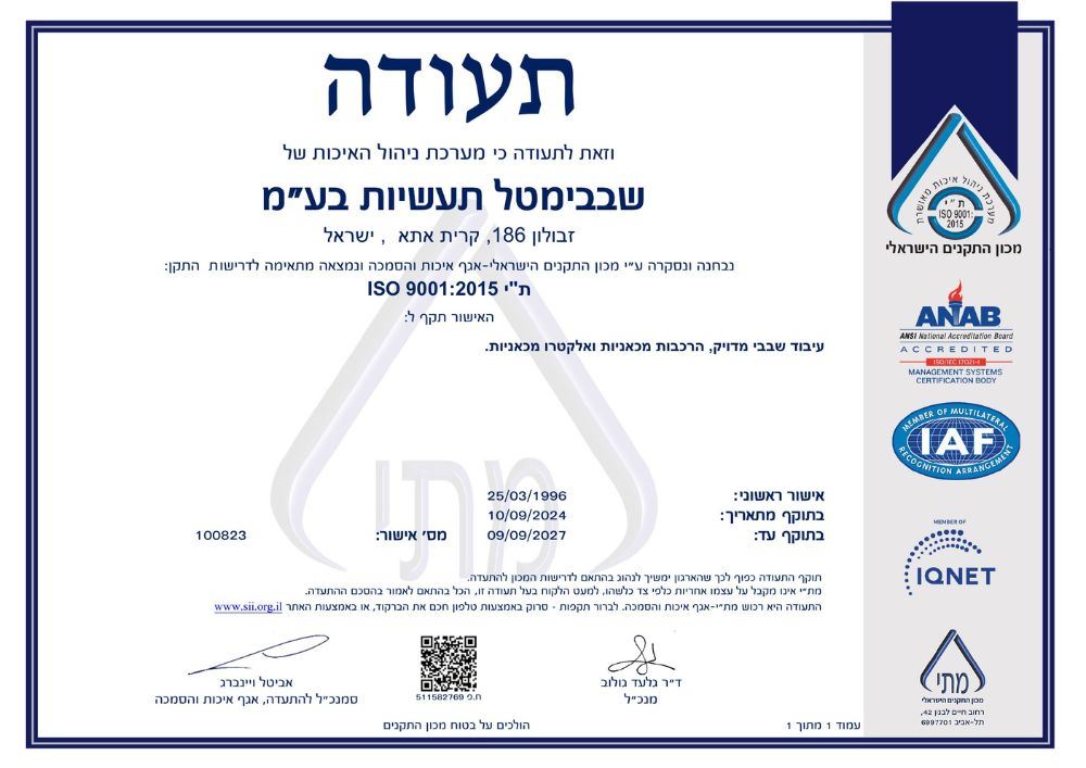 איכות בשבבימטל מובנית בכל שלב בתהליך הייצור. ההסמכות שלנו משקפות מחויבות ארוכת שנים לעיבוד שבבי CNC מדויק, בקרת תהליכים, עקיבות ושיפור מתמיד עבור תעשיות תובעניות.