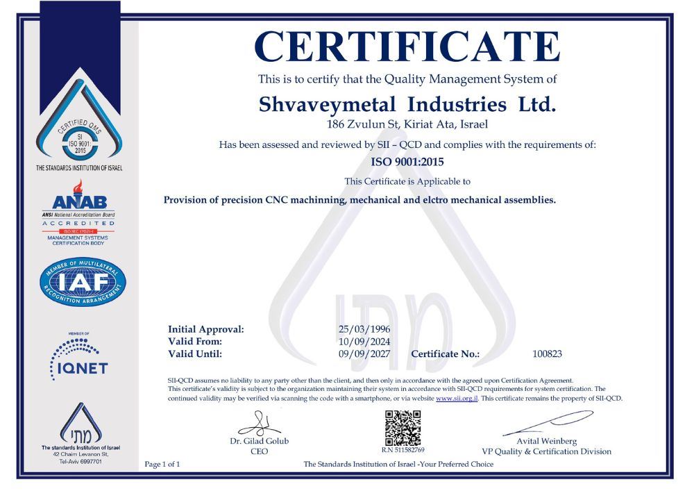 מתקני ISO 9001 ו-AS9100D ועד נהלי איכות קפדניים, הסמכות אלו תומכות באמינות, בעקביות ובעמידה בדרישות שלהן מצפים לקוחותינו.